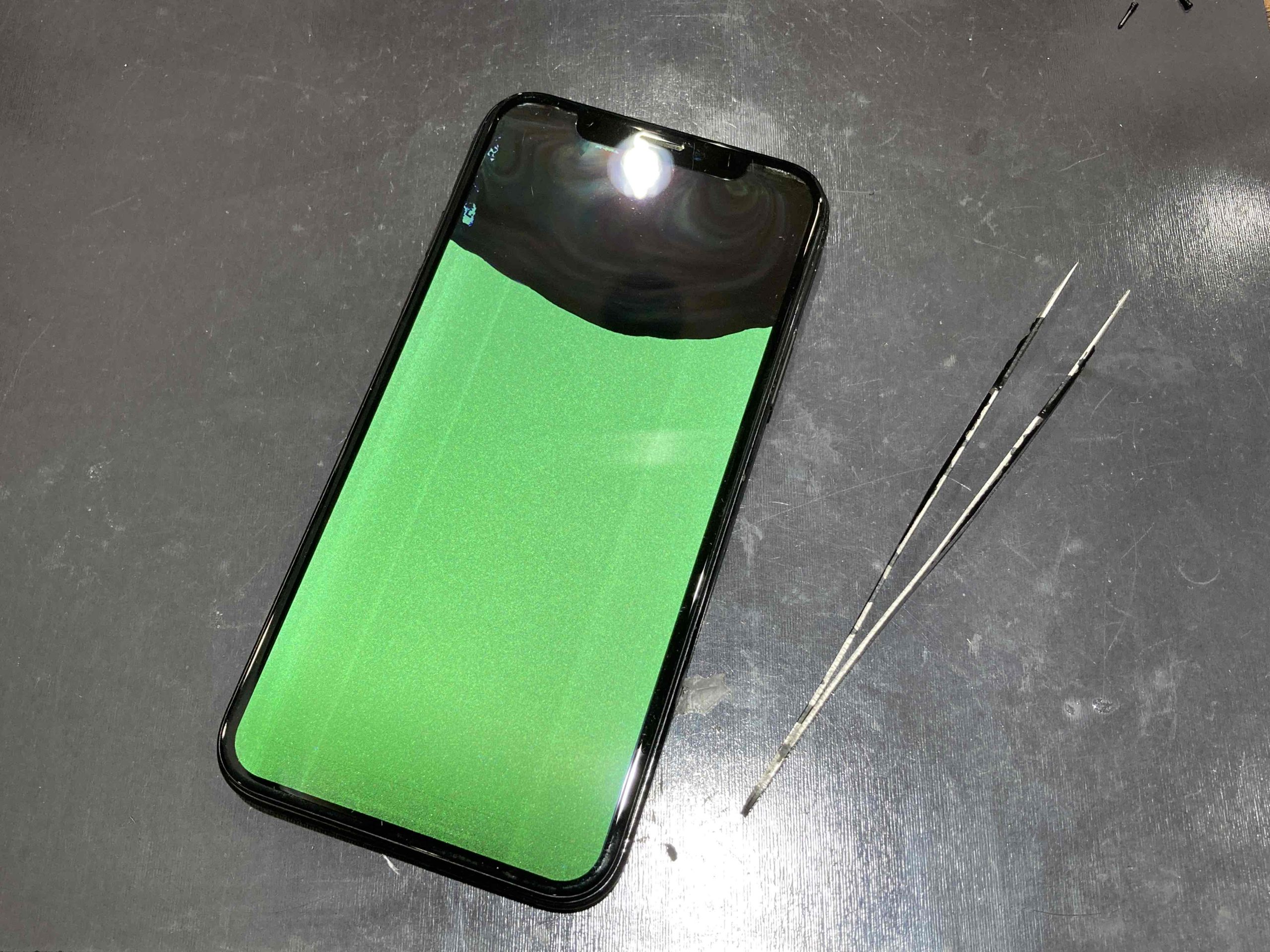 水没してしまった端末は写真のように画面が緑色になってしまう場合があります。